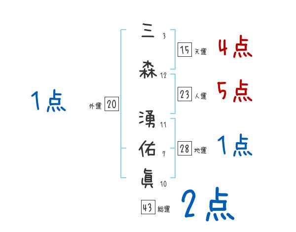 人運![]() | 三森湧佑眞さんの人運は23画の5つ星!想像力に優れ活力がある。一代で成功し名誉を手に入れる。 性格や才能などを表す2番目に重要な運勢です。人間関係や協調性、社会的な成功に影響します。主に20歳から50歳ぐらいまでの中年期の運勢を表します。 |