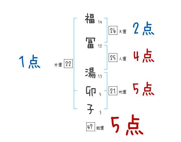 総運![]() | 福冨湯卯子さんの総運は47画の5つ星!実力が開花し発展する円満な人生。財に恵まれる。 あなたの人生を表す1番重要な運勢です。生涯を通じて影響する総合運となり、主に50歳以降の晩年期に影響を及ぼします。 |