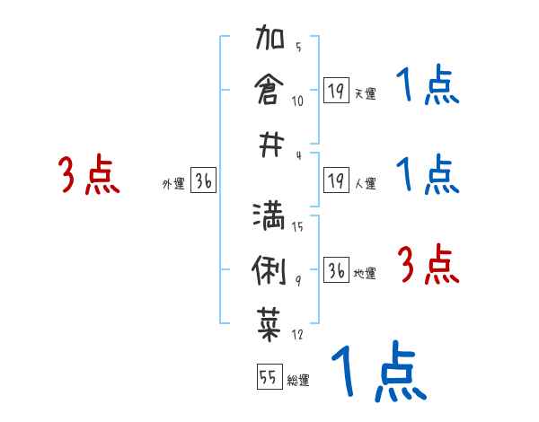 外運![]() | 加倉井満俐菜さんの外運は36画の3つ星!先見性が豊かです。多少神経質で苦労することも。 生活面を象徴する運勢です。外部から受ける影響力を表し、結婚運、家庭運や職場、環境への順応性を表します。 |
