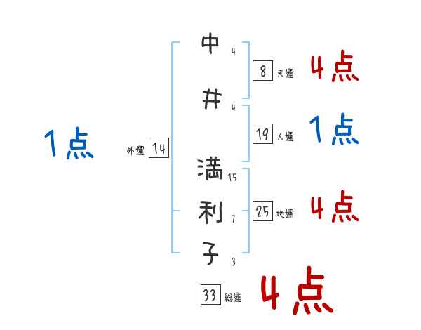 外運![]() | 中井満利子さんの外運は14画の1つ星!人に対して優しいがストレスを溜め込みがち。人間関係のトラブルを避けるよう気をつけましょう。 生活面を象徴する運勢です。外部から受ける影響力を表し、結婚運、家庭運や職場、環境への順応性を表します。 |