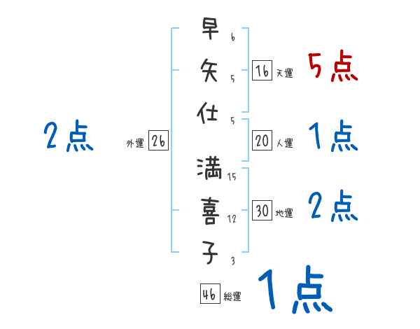 外運![]() | 早矢仕満喜子さんの外運は26画の2つ星!波瀾万丈かも。信頼できる人を大事にしましょう。 生活面を象徴する運勢です。外部から受ける影響力を表し、結婚運、家庭運や職場、環境への順応性を表します。 |