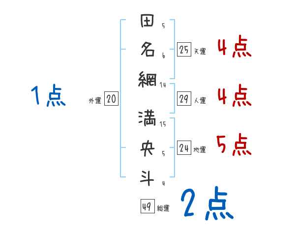 天運![]() | 田名網満央斗さんの天運は25画の4つ星!個性があり才能があふれる。強運の持ち主で発展する。 家系が持つ宿命的な運勢を表します。祖先から受け継いだ苗字ですので自分の力が及びません。家柄を象徴します。 |