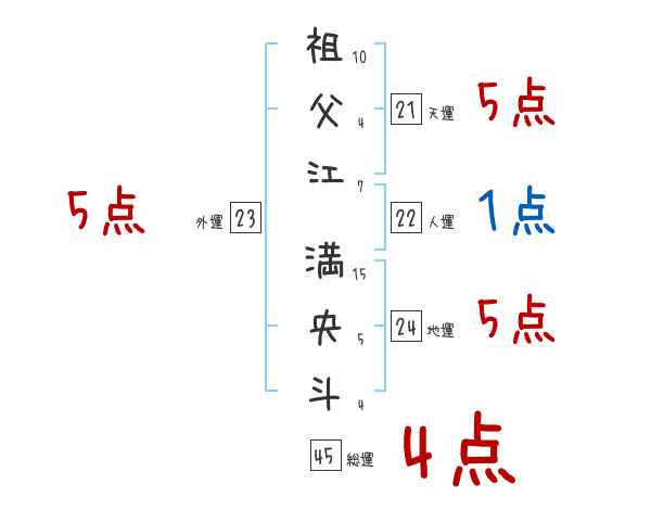 天運![]()  | 祖父江満央斗さんの天運は21画の5つ星!統率力がある。独立し成功する。名誉を手に入れる。 家系が持つ宿命的な運勢を表します。祖先から受け継いだ苗字ですので自分の力が及びません。家柄を象徴します。 |