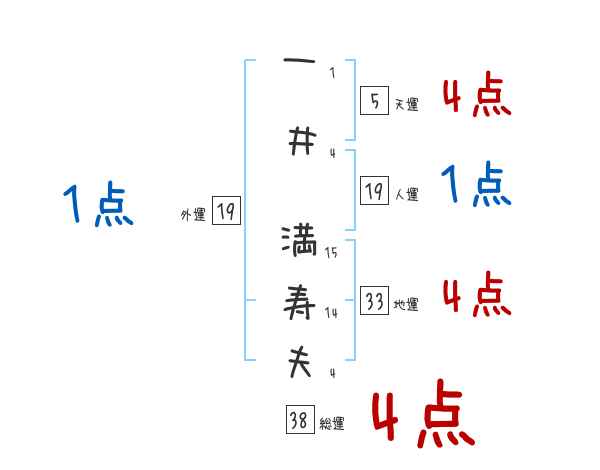 天運![]() | 一井満寿夫さんの天運は5画の4つ星!健康で安泰。協調性に優れ、財産に恵まれる。 家系が持つ宿命的な運勢を表します。祖先から受け継いだ苗字ですので自分の力が及びません。家柄を象徴します。 |