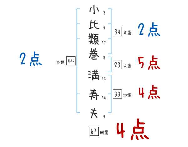 外運![]() | 小比類巻満寿夫さんの外運は44画の2つ星!誠実で慎重な性格。物事を考えすぎないように注意しましょう。 生活面を象徴する運勢です。外部から受ける影響力を表し、結婚運、家庭運や職場、環境への順応性を表します。 |