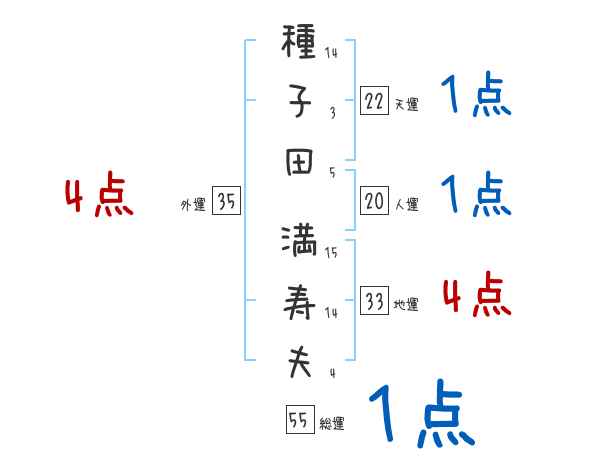 外運![]() | 種子田満寿夫さんの外運は35画の4つ星!温厚な性格で感受性が高い。穏和な性格で人望が厚い。 生活面を象徴する運勢です。外部から受ける影響力を表し、結婚運、家庭運や職場、環境への順応性を表します。 |