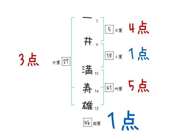 天運![]() | 一井満寿雄さんの天運は5画の4つ星!健康で安泰。協調性に優れ、財産に恵まれる。 家系が持つ宿命的な運勢を表します。祖先から受け継いだ苗字ですので自分の力が及びません。家柄を象徴します。 |