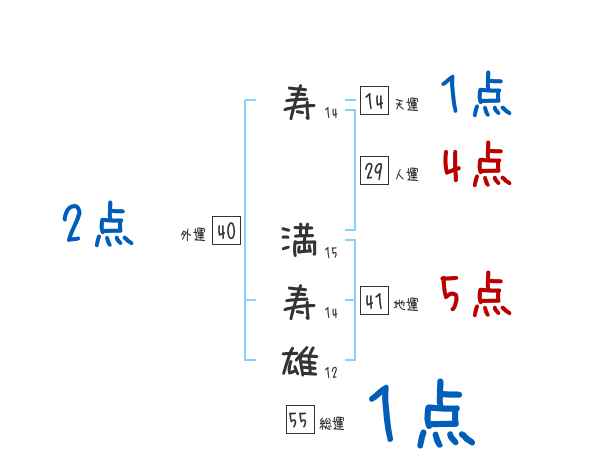 天運![]() | 寿満寿雄さんの天運は14画の1つ星!人に対して優しいがストレスを溜め込みがち。人間関係のトラブルを避けるよう気をつけましょう。 家系が持つ宿命的な運勢を表します。祖先から受け継いだ苗字ですので自分の力が及びません。家柄を象徴します。 |