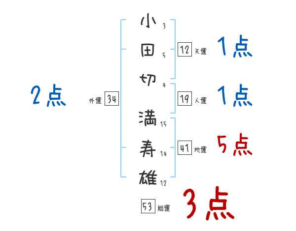 外運![]() | 小田切満寿雄さんの外運は34画の2つ星!独創性に優れるが、自尊心が強く災難に注意しましょう。 生活面を象徴する運勢です。外部から受ける影響力を表し、結婚運、家庭運や職場、環境への順応性を表します。 |