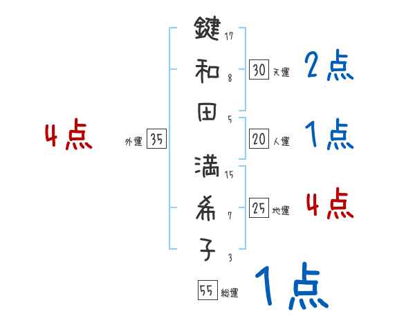 天運![]() | 鍵和田満希子さんの天運は30画の2つ星!浮き沈みの激しさに注意しましょう。 家系が持つ宿命的な運勢を表します。祖先から受け継いだ苗字ですので自分の力が及びません。家柄を象徴します。 |