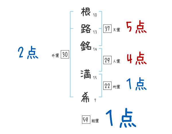 外運![]() | 根路銘満希さんの外運は30画の2つ星!浮き沈みの激しさに注意しましょう。 生活面を象徴する運勢です。外部から受ける影響力を表し、結婚運、家庭運や職場、環境への順応性を表します。 |