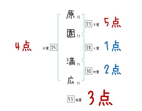 天運![]() | 原園満広さんの天運は23画の5つ星!想像力に優れ活力がある。一代で成功し名誉を手に入れる。 家系が持つ宿命的な運勢を表します。祖先から受け継いだ苗字ですので自分の力が及びません。家柄を象徴します。 |