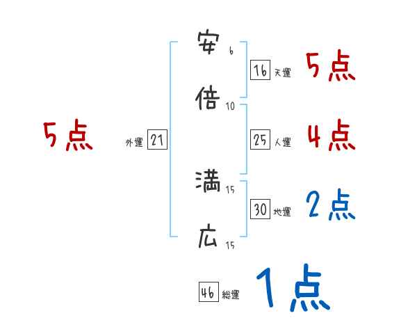天運![]() | 安倍満広さんの天運は16画の5つ星!人望が厚く大きく発展する。逆転成功が見える。 家系が持つ宿命的な運勢を表します。祖先から受け継いだ苗字ですので自分の力が及びません。家柄を象徴します。 |