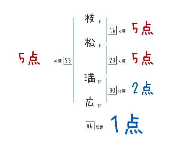 人運![]() | 枝松満広さんの人運は23画の5つ星!想像力に優れ活力がある。一代で成功し名誉を手に入れる。 性格や才能などを表す2番目に重要な運勢です。人間関係や協調性、社会的な成功に影響します。主に20歳から50歳ぐらいまでの中年期の運勢を表します。 |