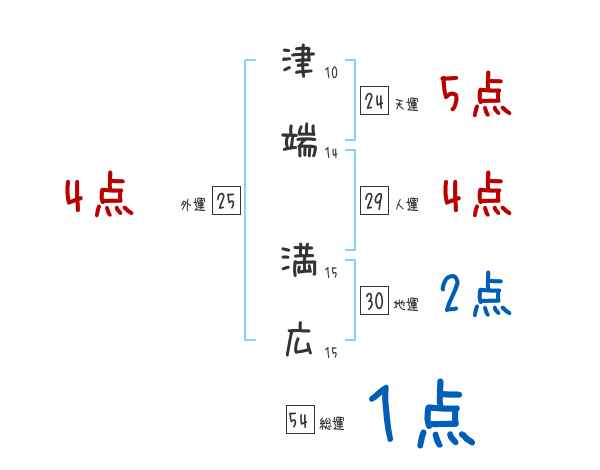 総運![]() | 津端満広さんの総運は54画の1つ星!トラブルが多いかも。周りをよく見て協調して過ごしましょう。 あなたの人生を表す1番重要な運勢です。生涯を通じて影響する総合運となり、主に50歳以降の晩年期に影響を及ぼします。 |