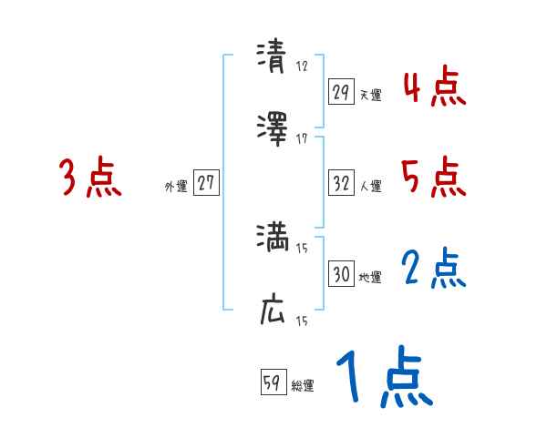 人運![]() | 清澤満広さんの人運は32画の5つ星!柔軟性があり成功する。チャンスが多く金運が良い。 性格や才能などを表す2番目に重要な運勢です。人間関係や協調性、社会的な成功に影響します。主に20歳から50歳ぐらいまでの中年期の運勢を表します。 |