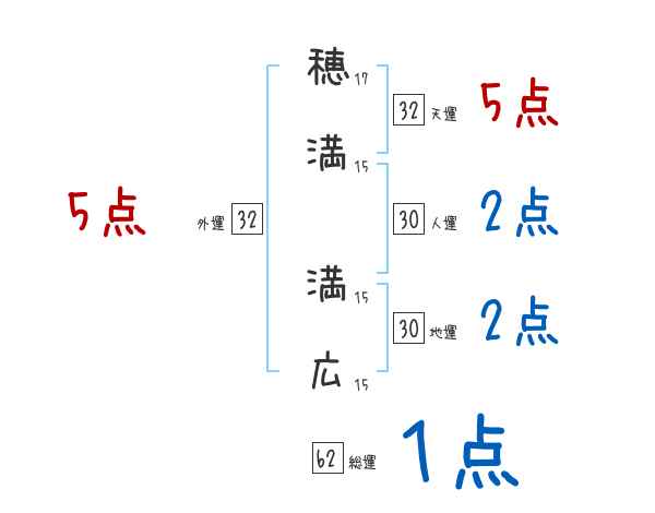 外運![]() | 穂満満広さんの外運は32画の5つ星!柔軟性があり成功する。チャンスが多く金運が良い。 生活面を象徴する運勢です。外部から受ける影響力を表し、結婚運、家庭運や職場、環境への順応性を表します。 |