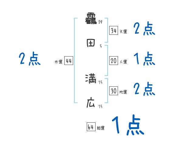 外運![]() | 靏田満広さんの外運は44画の2つ星!誠実で慎重な性格。物事を考えすぎないように注意しましょう。 生活面を象徴する運勢です。外部から受ける影響力を表し、結婚運、家庭運や職場、環境への順応性を表します。 |
