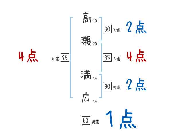 天運![]() | 高瀬満広さんの天運は30画の2つ星!浮き沈みの激しさに注意しましょう。 家系が持つ宿命的な運勢を表します。祖先から受け継いだ苗字ですので自分の力が及びません。家柄を象徴します。 |