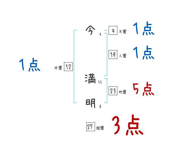 天運![]() | 今満明さんの天運は4画の1つ星!感情が不安定で苦労するかも。周囲との協調を心掛けましょう。 家系が持つ宿命的な運勢を表します。祖先から受け継いだ苗字ですので自分の力が及びません。家柄を象徴します。 |