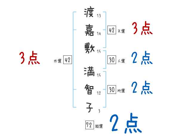 総運![]() | 渡嘉敷満智子さんの総運は72画の2つ星!災難が多く不安定な生活にならないように注意。明暗のある人生かも。 あなたの人生を表す1番重要な運勢です。生涯を通じて影響する総合運となり、主に50歳以降の晩年期に影響を及ぼします。 |