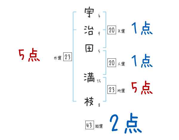 外運![]() | 宇治田満枝さんの外運は23画の5つ星!想像力に優れ活力がある。一代で成功し名誉を手に入れる。 生活面を象徴する運勢です。外部から受ける影響力を表し、結婚運、家庭運や職場、環境への順応性を表します。 |