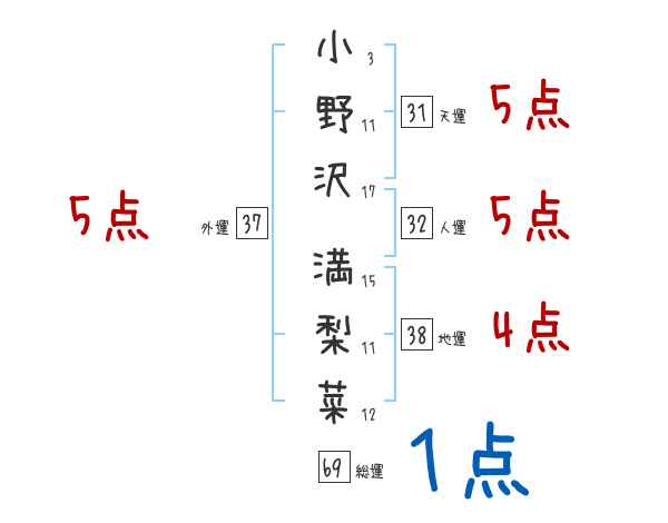 人運![]() | 小野沢満梨菜さんの人運は32画の5つ星!柔軟性があり成功する。チャンスが多く金運が良い。 性格や才能などを表す2番目に重要な運勢です。人間関係や協調性、社会的な成功に影響します。主に20歳から50歳ぐらいまでの中年期の運勢を表します。 |