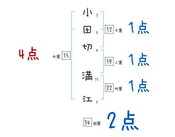 総運![]() | 小田切満江さんの総運は34画の2つ星!独創性に優れるが、自尊心が強く災難に注意しましょう。 あなたの人生を表す1番重要な運勢です。生涯を通じて影響する総合運となり、主に50歳以降の晩年期に影響を及ぼします。 |