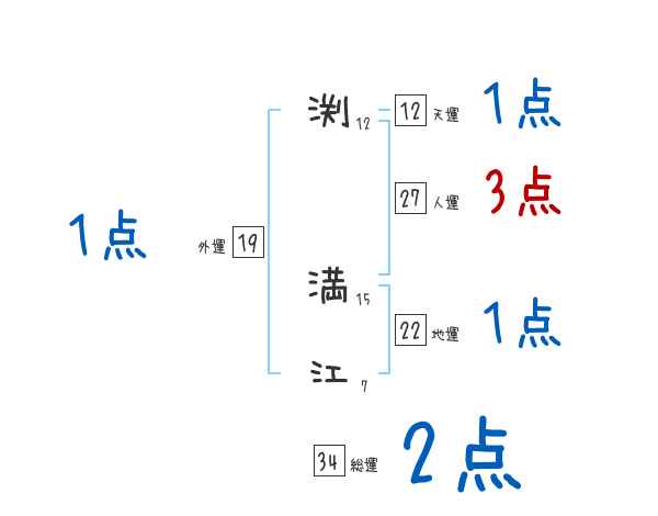総運![]() | 渕満江さんの総運は34画の2つ星!独創性に優れるが、自尊心が強く災難に注意しましょう。 あなたの人生を表す1番重要な運勢です。生涯を通じて影響する総合運となり、主に50歳以降の晩年期に影響を及ぼします。 |