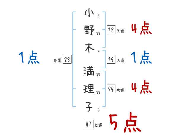 天運![]() | 小野木満理子さんの天運は18画の4つ星!情熱的で剛気。忍耐力があり信頼される。 家系が持つ宿命的な運勢を表します。祖先から受け継いだ苗字ですので自分の力が及びません。家柄を象徴します。 |
