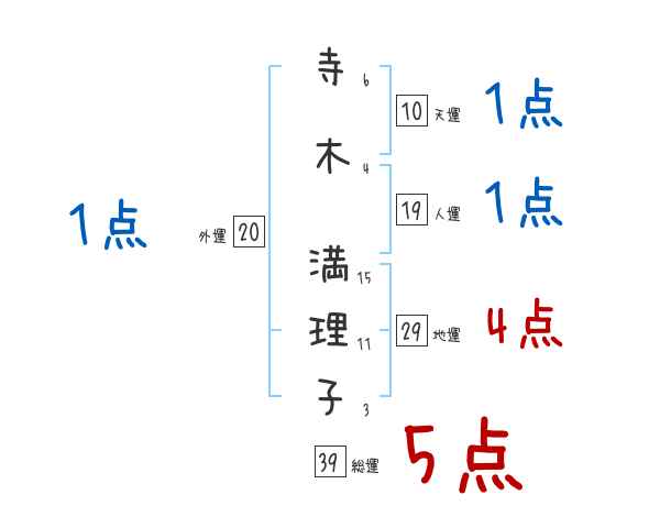 天運![]() | 寺木満理子さんの天運は10画の1つ星!不安を感じやすい傾向。ストレスを抱えないように注意しましょう。 家系が持つ宿命的な運勢を表します。祖先から受け継いだ苗字ですので自分の力が及びません。家柄を象徴します。 |
