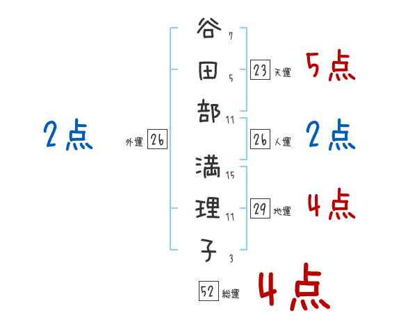 外運![]() | 谷田部満理子さんの外運は26画の2つ星!波瀾万丈かも。信頼できる人を大事にしましょう。 生活面を象徴する運勢です。外部から受ける影響力を表し、結婚運、家庭運や職場、環境への順応性を表します。 |