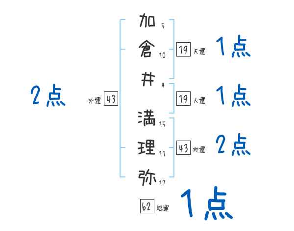 外運![]() | 加倉井満理弥さんの外運は43画の2つ星!頑固な性格で独立心が強いかも。やや非現実的で浪費に注意しましょう。 生活面を象徴する運勢です。外部から受ける影響力を表し、結婚運、家庭運や職場、環境への順応性を表します。 |
