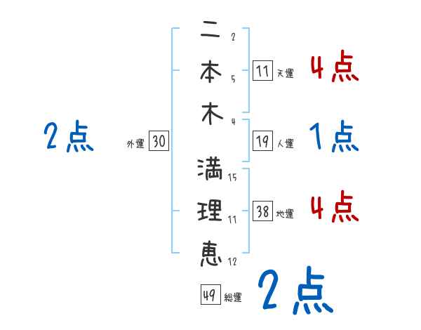 天運![]() | 二本木満理恵さんの天運は11画の4つ星!着実に富や地位を得る幸運な人生。 家系が持つ宿命的な運勢を表します。祖先から受け継いだ苗字ですので自分の力が及びません。家柄を象徴します。 |