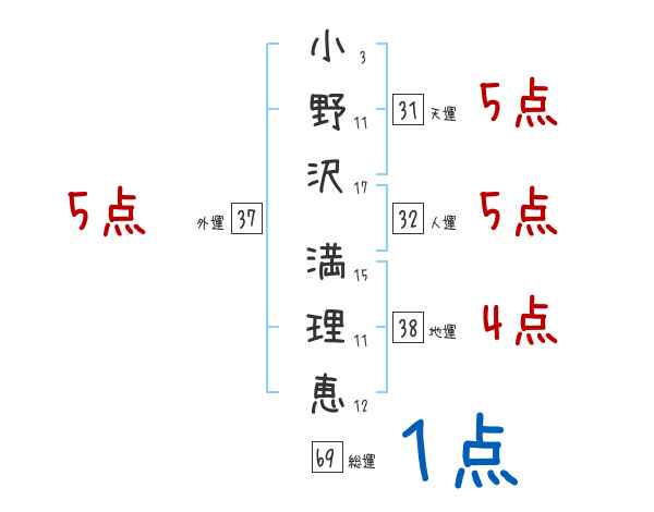 人運![]() | 小野沢満理恵さんの人運は32画の5つ星!柔軟性があり成功する。チャンスが多く金運が良い。 性格や才能などを表す2番目に重要な運勢です。人間関係や協調性、社会的な成功に影響します。主に20歳から50歳ぐらいまでの中年期の運勢を表します。 |