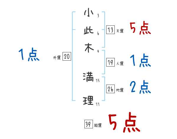 総運![]() | 小此木満理さんの総運は39画の5つ星!社交性に優れ人望が厚い。人の上に立ち成功する。 あなたの人生を表す1番重要な運勢です。生涯を通じて影響する総合運となり、主に50歳以降の晩年期に影響を及ぼします。 |