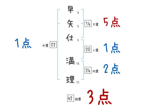 外運![]() | 早矢仕満理さんの外運は22画の1つ星!努力することが苦手ないっぽう手先が器用。芸術性にも優れる。 生活面を象徴する運勢です。外部から受ける影響力を表し、結婚運、家庭運や職場、環境への順応性を表します。 |