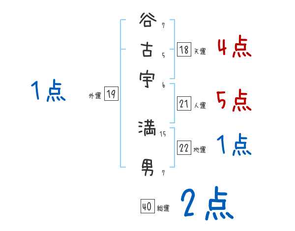 天運![]() | 谷古宇満男さんの天運は18画の4つ星!情熱的で剛気。忍耐力があり信頼される。 家系が持つ宿命的な運勢を表します。祖先から受け継いだ苗字ですので自分の力が及びません。家柄を象徴します。 |