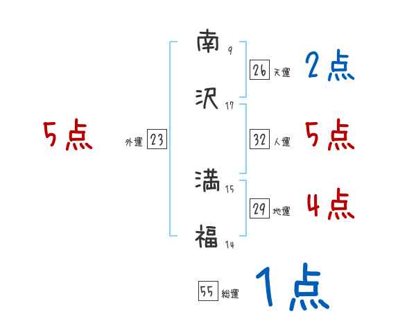 人運![]() | 南沢満福さんの人運は32画の5つ星!柔軟性があり成功する。チャンスが多く金運が良い。 性格や才能などを表す2番目に重要な運勢です。人間関係や協調性、社会的な成功に影響します。主に20歳から50歳ぐらいまでの中年期の運勢を表します。 |