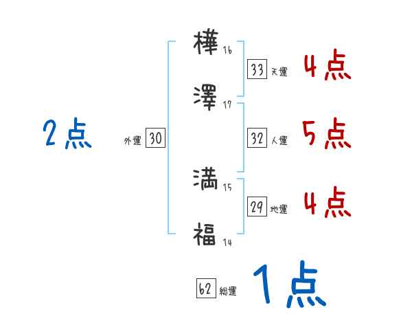 人運![]() | 樺澤満福さんの人運は32画の5つ星!柔軟性があり成功する。チャンスが多く金運が良い。 性格や才能などを表す2番目に重要な運勢です。人間関係や協調性、社会的な成功に影響します。主に20歳から50歳ぐらいまでの中年期の運勢を表します。 |