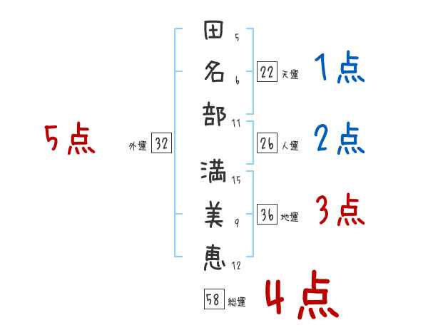 外運![]() | 田名部満美恵さんの外運は32画の5つ星!柔軟性があり成功する。チャンスが多く金運が良い。 生活面を象徴する運勢です。外部から受ける影響力を表し、結婚運、家庭運や職場、環境への順応性を表します。 |