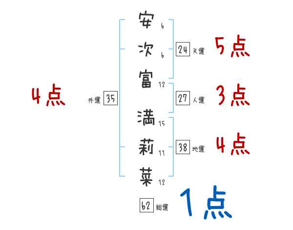 天運![]() | 安次富満莉菜さんの天運は24画の5つ星!家庭運が良く順調な人生。金運にも恵まれる。 家系が持つ宿命的な運勢を表します。祖先から受け継いだ苗字ですので自分の力が及びません。家柄を象徴します。 |