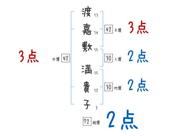 外運![]() | 渡嘉敷満貴子さんの外運は42画の3つ星!病気に注意。多芸であるが消極的でおとなしい。 生活面を象徴する運勢です。外部から受ける影響力を表し、結婚運、家庭運や職場、環境への順応性を表します。 |