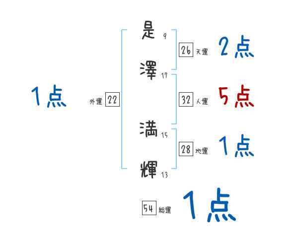人運![]() | 是澤満輝さんの人運は32画の5つ星!柔軟性があり成功する。チャンスが多く金運が良い。 性格や才能などを表す2番目に重要な運勢です。人間関係や協調性、社会的な成功に影響します。主に20歳から50歳ぐらいまでの中年期の運勢を表します。 |