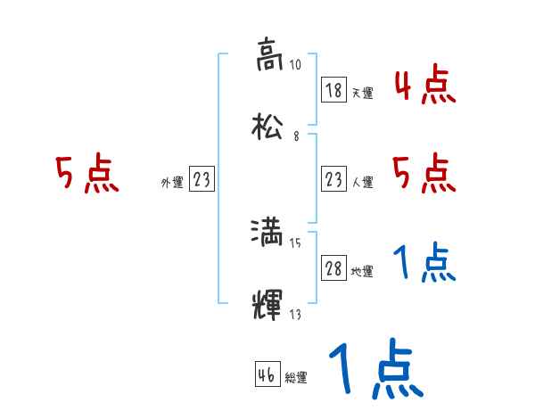 天運![]() | 高松満輝さんの天運は18画の4つ星!情熱的で剛気。忍耐力があり信頼される。 家系が持つ宿命的な運勢を表します。祖先から受け継いだ苗字ですので自分の力が及びません。家柄を象徴します。 |