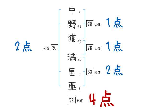 天運![]() | 中野渡満里亜さんの天運は28画の1つ星!家庭環境に注意。スポーツで活躍できる能力があるかも。 家系が持つ宿命的な運勢を表します。祖先から受け継いだ苗字ですので自分の力が及びません。家柄を象徴します。 |