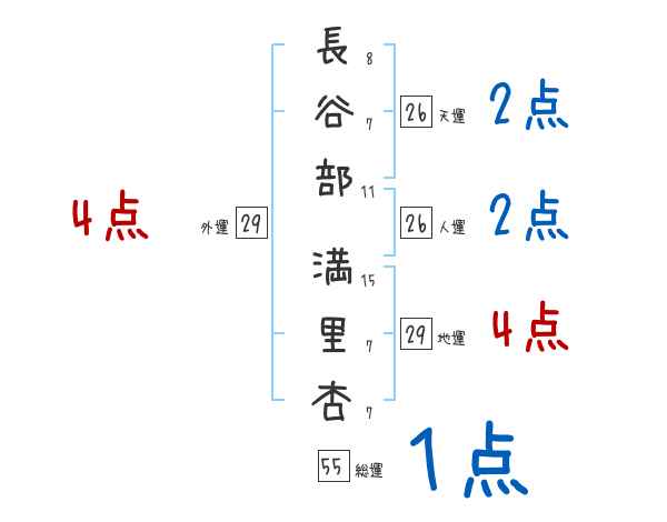 天運![]() | 長谷部満里杏さんの天運は26画の2つ星!波瀾万丈かも。信頼できる人を大事にしましょう。 家系が持つ宿命的な運勢を表します。祖先から受け継いだ苗字ですので自分の力が及びません。家柄を象徴します。 |