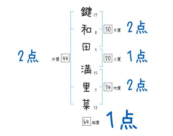 天運![]() | 鍵和田満里菜さんの天運は30画の2つ星!浮き沈みの激しさに注意しましょう。 家系が持つ宿命的な運勢を表します。祖先から受け継いだ苗字ですので自分の力が及びません。家柄を象徴します。 |
