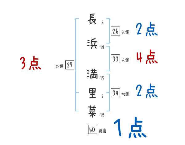 天運![]() | 長浜満里菜さんの天運は26画の2つ星!波瀾万丈かも。信頼できる人を大事にしましょう。 家系が持つ宿命的な運勢を表します。祖先から受け継いだ苗字ですので自分の力が及びません。家柄を象徴します。 |