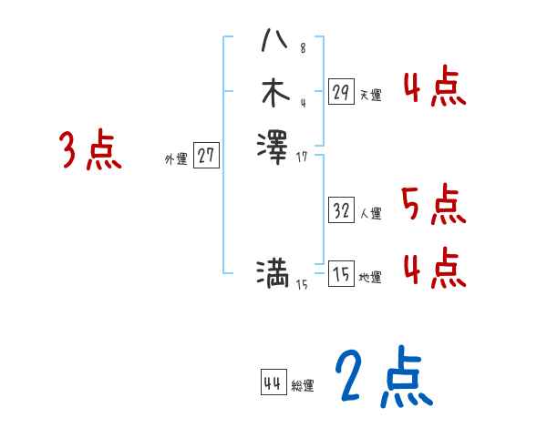 人運![]() | 八木澤満さんの人運は32画の5つ星!柔軟性があり成功する。チャンスが多く金運が良い。 性格や才能などを表す2番目に重要な運勢です。人間関係や協調性、社会的な成功に影響します。主に20歳から50歳ぐらいまでの中年期の運勢を表します。 |